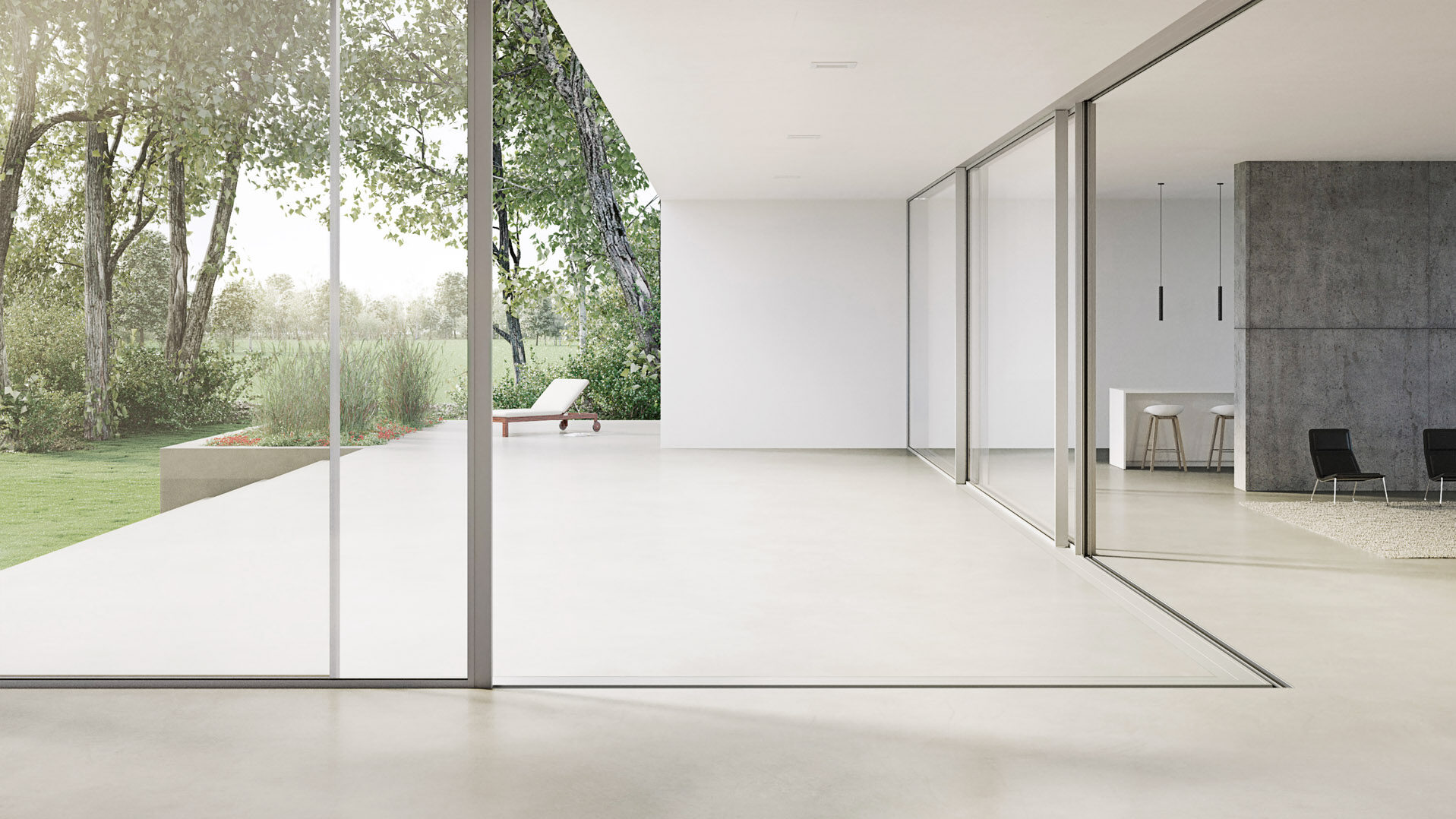 Przestrzeń bez ograniczeń – wąskie ramy sprawiają, że to szkło, a nie profil, nadaje rytm architekturze.