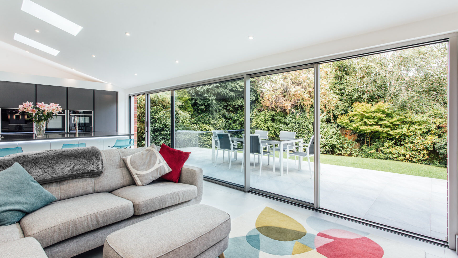 Efekt otwartej przestrzeni – okna cienkoramowe płynnie łączą salon z ogrodem czy tarasem, tworząc nową jakość codziennego życia.
