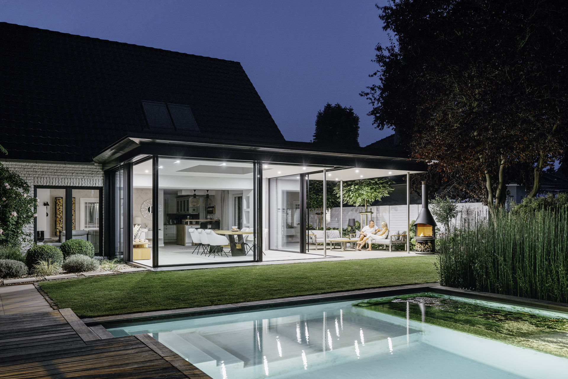 Wolnostojący lub jako rozbudowa budynku – z możliwością wyboru drzwi harmonijkowych lub panoramicznych drzwi przesuwnych cero. Robi wrażenie!