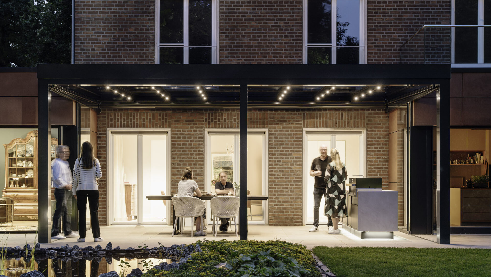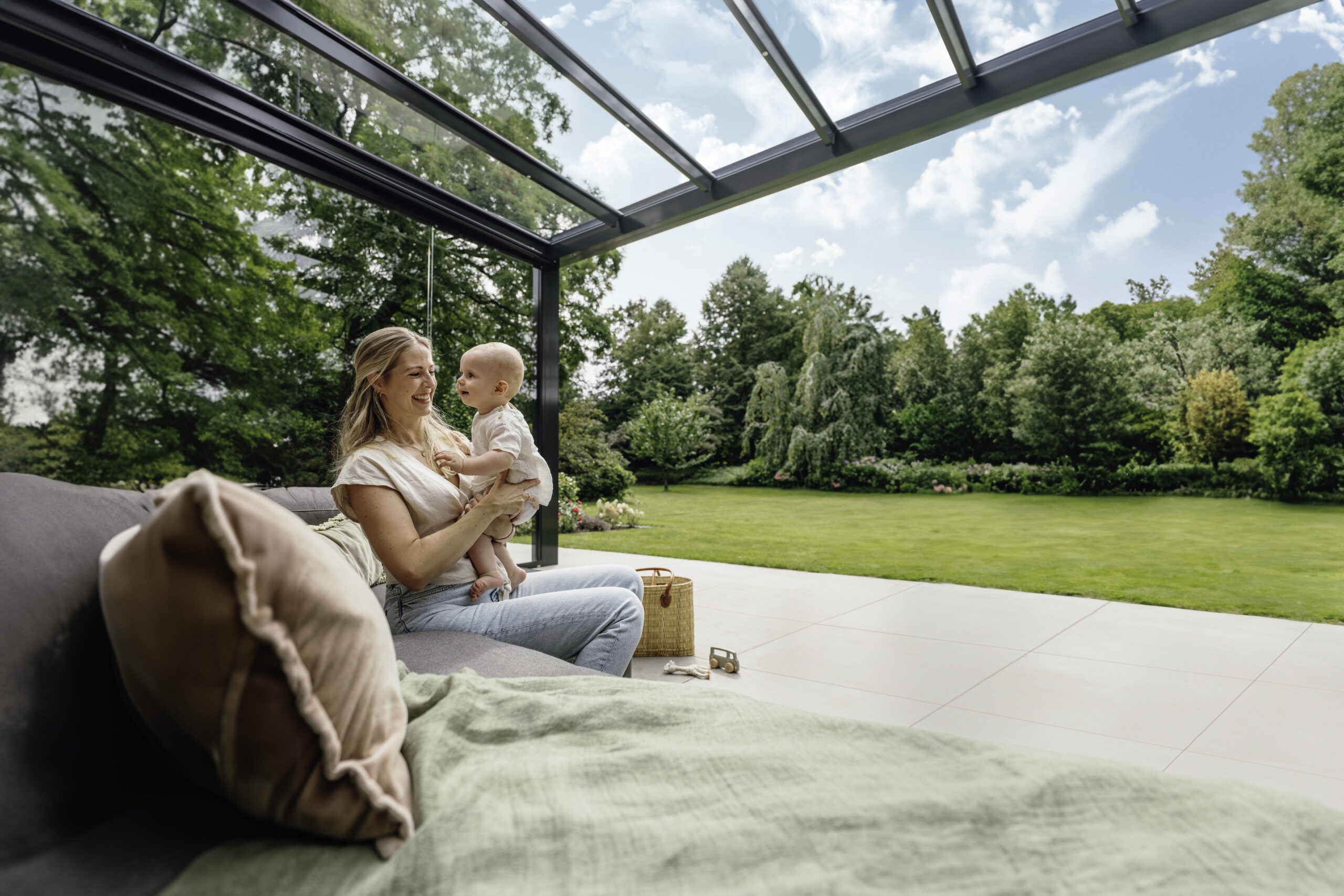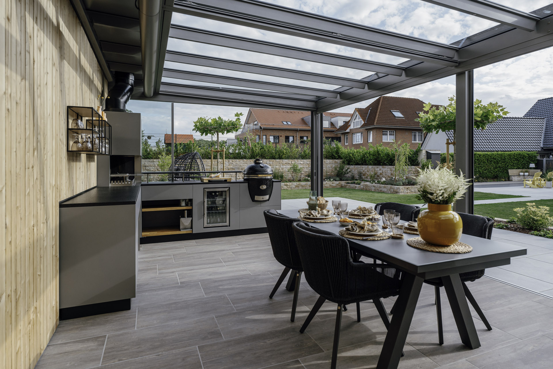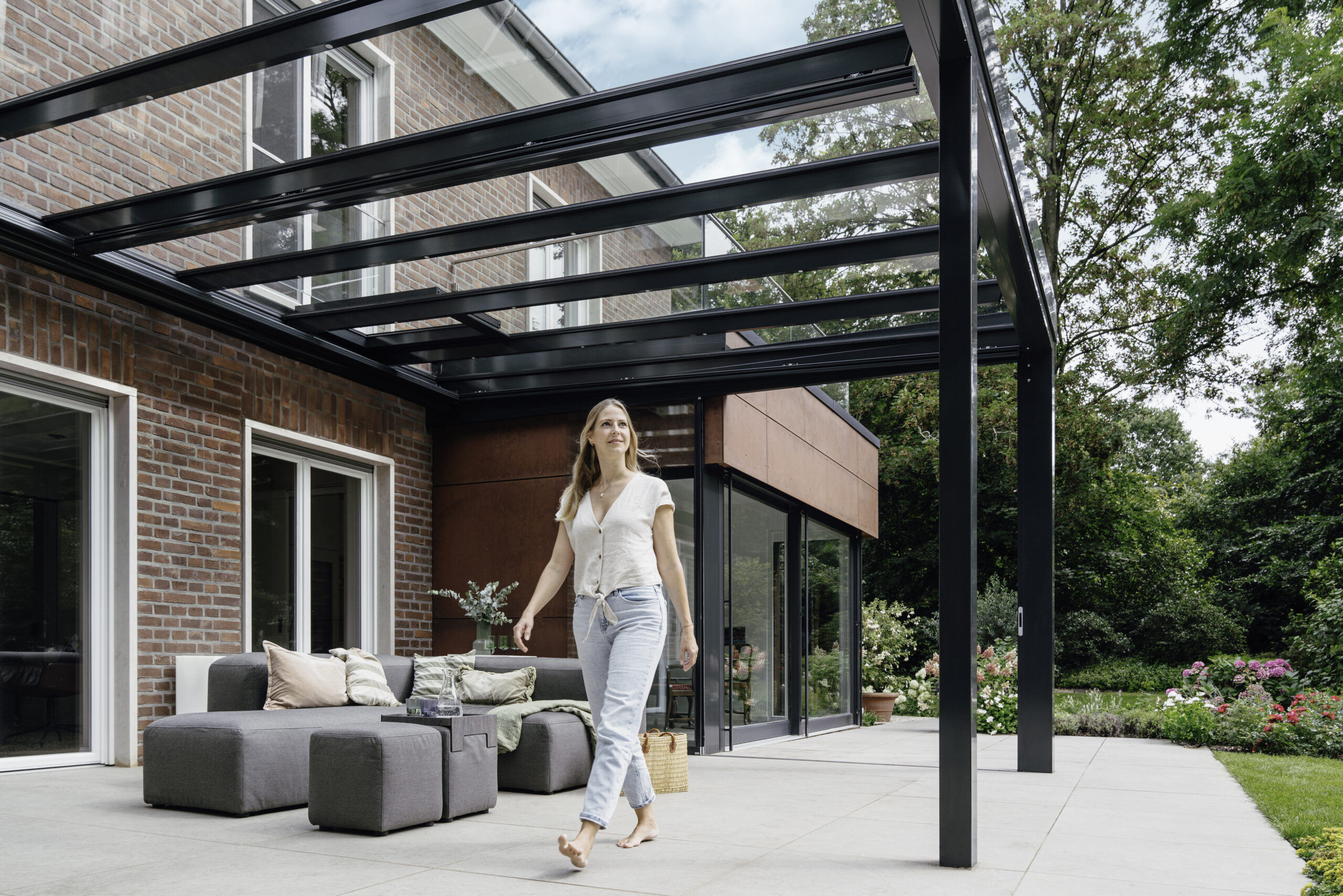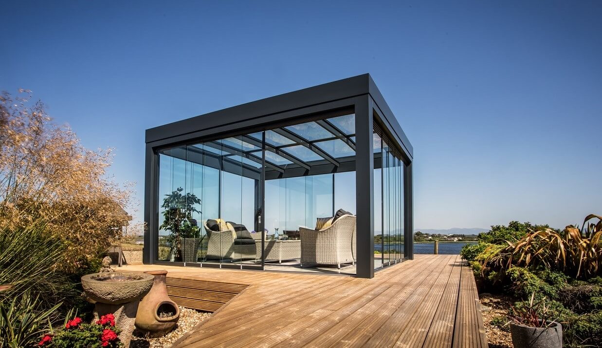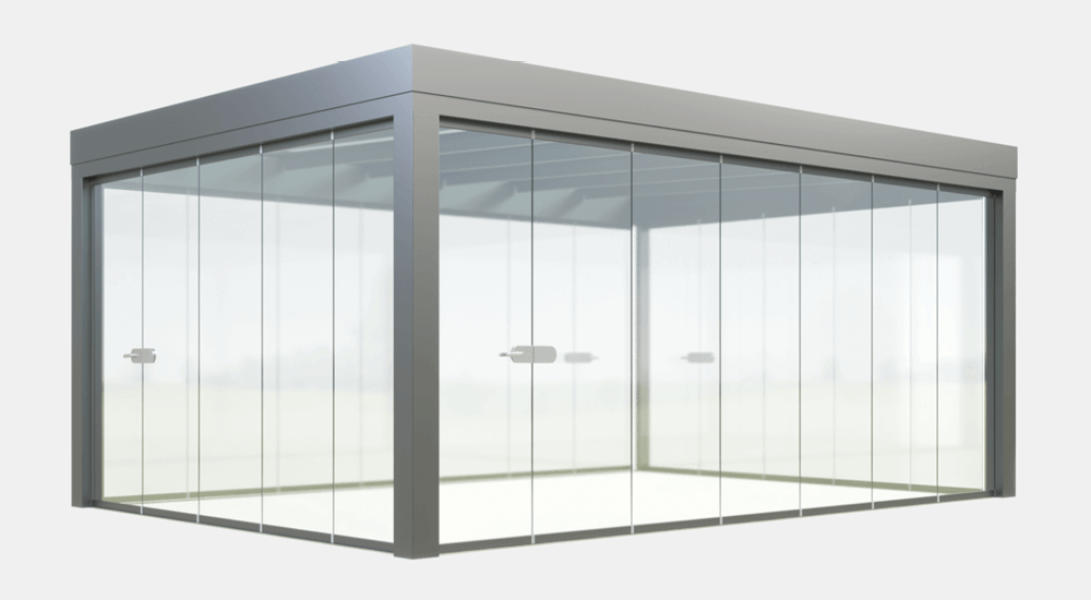 Po dodaniu bocznych paneli przesuwnych z funkcją obrotu, zadaszenie można łatwo przekształcić w efektowny, przeszklony ogród zimowy lub pokój ogrodowy. Panele szklane można całkowicie zamknąć, aby chronić się przed wiatrem i deszczem, lub złożyć je w narożniku, aby otworzyć przestrzeń w sprzyjających warunkach pogodowych. Alternatywnie dostępne są także drzwi przesuwne, harmonijkowe oraz przeszklenia stałe.