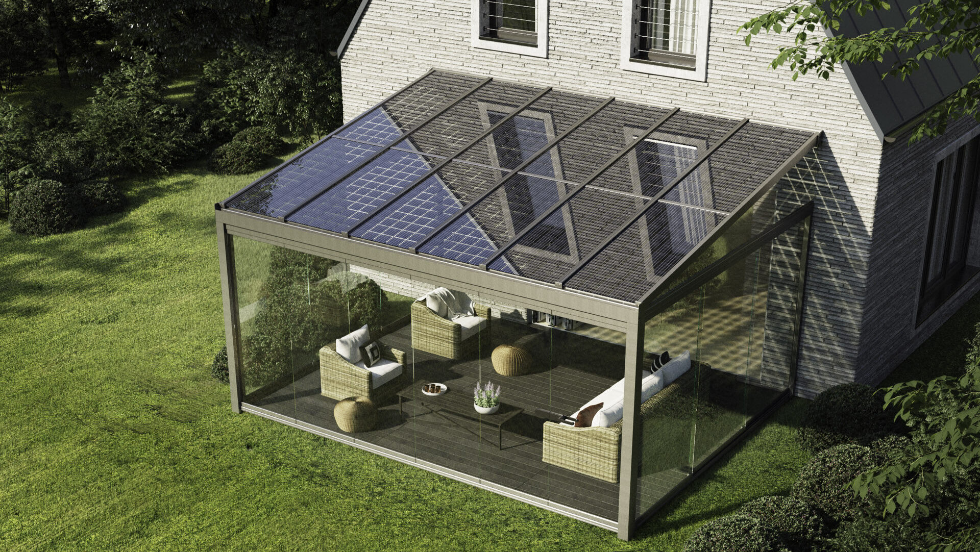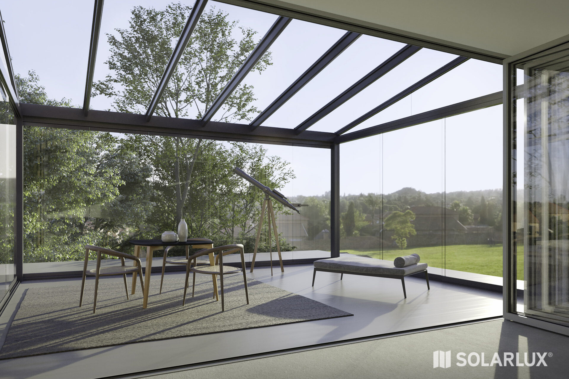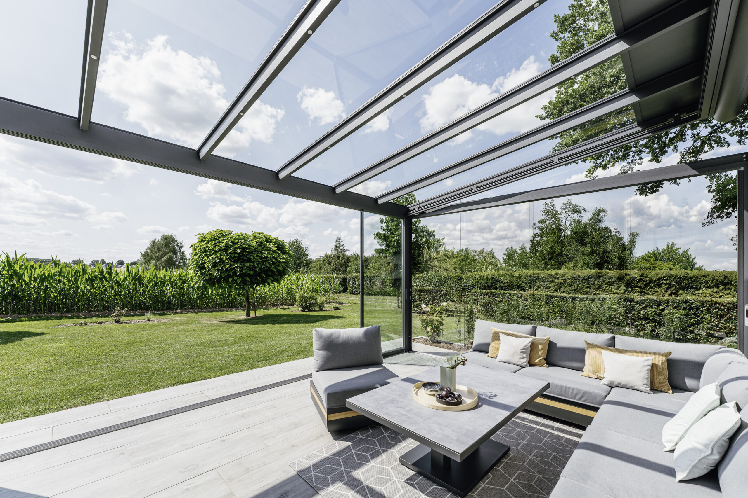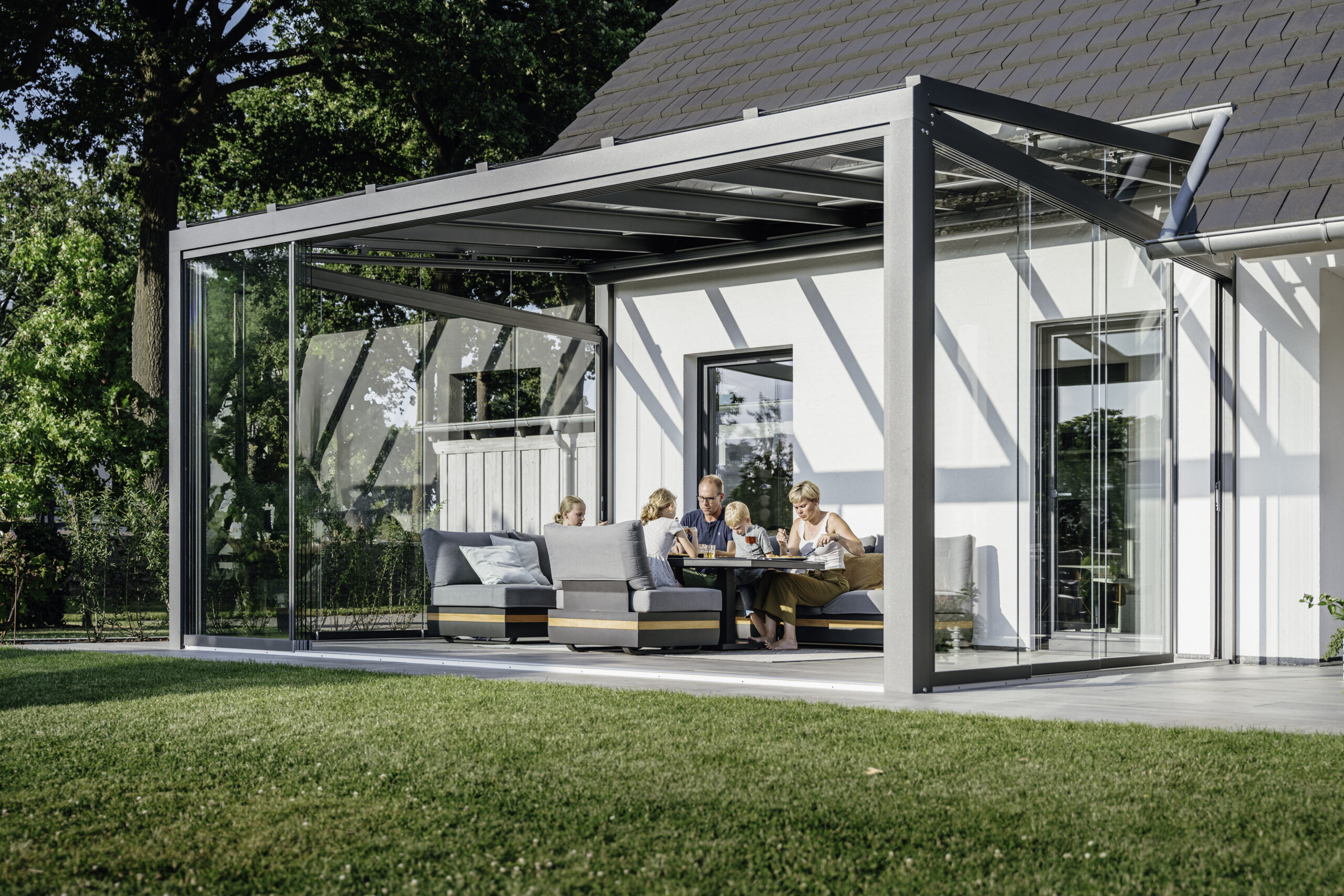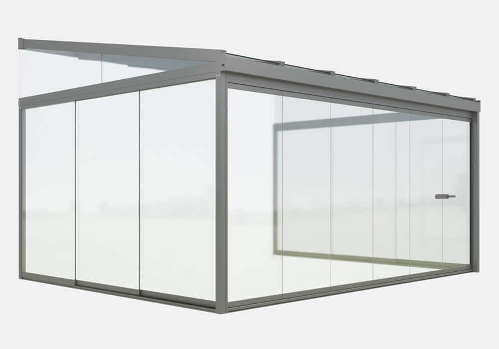 Po dodaniu bocznych paneli przesuwnych z funkcją obrotu zadaszenie można łatwo przekształcić w efektowną, przeszkloną oranżerię lub ogrodowy pokój. Panele szklane można całkowicie zamknąć, aby chronić się przed wiatrem i deszczem, lub złożyć je w rogu konstrukcji, otwierając przestrzeń w sprzyjających warunkach pogodowych. Alternatywnie dostępne są drzwi przesuwne, harmonijkowe oraz przeszklenia stałe.